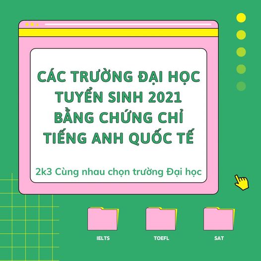 Các trường đại học tuyển sinh 2021 bằng chứng chỉ tiếng Anh quốc tế gồm Đại học Bách khoa Hà Nội, Đại học Quốc gia Hà Nội, Đại học Công nghiệp Hà Nội, Đại học Tài nguyên và Môi trường Hà Nội, Đại học Giao thông Vận tải Hà Nội, Đại học FPT, Học viện Chính sách và Phát triển, Đại học Mỏ - Địa chất, Đại học Kinh tế - Luật, Đại học Luật TP.HCM.
