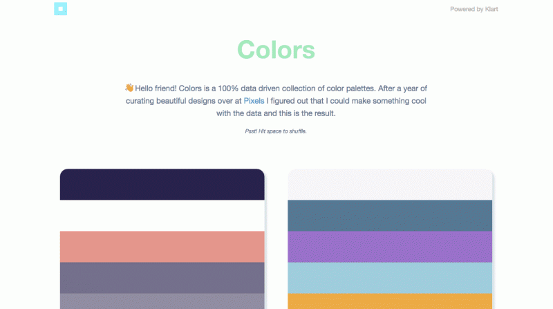 Klart Color là tuyển tập những màu sắc dựa trên dữ liệu. Nhấp vào biểu tượng mũi tên bên góc dưới bên phải để xem một bảng màu, rồi bấm vào bảng màu để xem lớn hơn, sau đó bấm lần nữa là bạn có thể copy chúng để sử dụng.