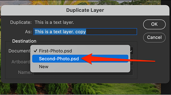Đối với cách này trước tiên bạn cũng cần phải mở cả 2 tab tài liệu Photoshop. Chọn tài liệu mà bạn muốn sao chép layer,trong bảng điều khiển “layer” trên thanh bên phải, bạn nhấp chuột phải vào layer mà bạn muốn sao chép và chọn “duplicate layer”. Trong cửa sổ Duplicate layer, tại Destination, bạn chọn tên tài liệu được sao chép thêm layer và ok là hoàn thành nhé.