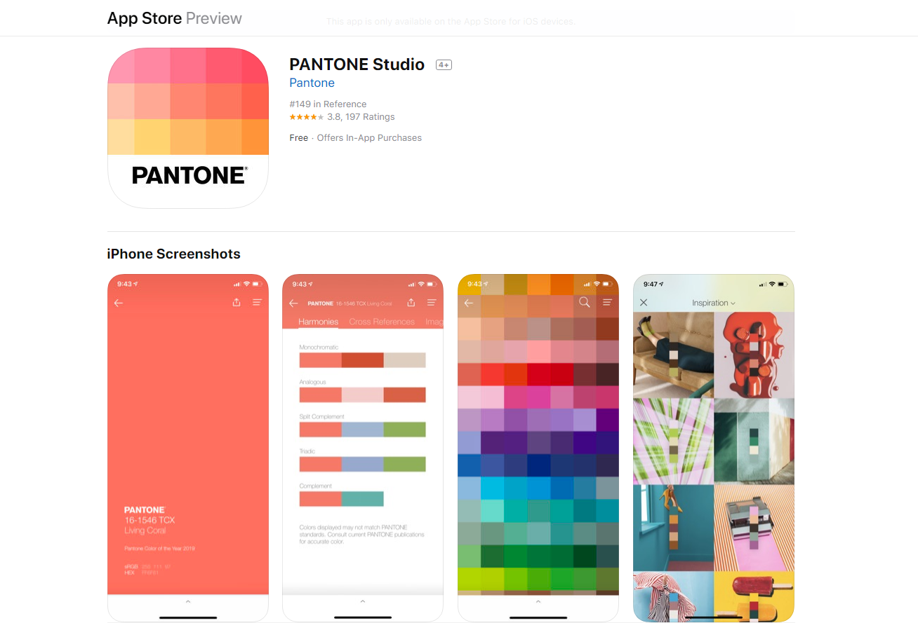 Pantone Studio là ứng dụng được phát triển bởi Pantone, ứng dụng này cho phép bạn tạo ra các bảng màu dựa trên các hình ảnh có sẵn lưu trong điện thoại. Với ứng dụng này, bạn có thể tạo và chia sẻ bảng màu giữa các cá nhân, các nhóm và chuyên gia trong ngành với phiên bản miễn phí. Với phiên bản có trả phí, bạn sẽ được tiếp cận với những công cụ mới cũng như những bảng màu tham chiếu được cung cấp bởi chính công ty. Điểm cộng là ứng dụng hỗ trợ 10 ngôn ngữ khác nhau nhưng hiện lại mới chỉ tương thích với hệ điều hành iOS 10.0 trở lên.