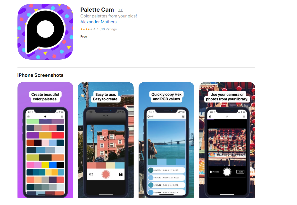 Từ những bức ảnh có sẵn trong thư viện điện thoại, Palette Cam cho phép bạn xác định những màu sắc chủ đạo của bức ảnh hay tạo ra các bảng màu từ chúng. Điểm khác biệt của Palette Cam so với Pantone Studio là nó xác định các màu cụ thể bao gồm các giá trị HEX và RBG, lưu lại chúng và thiết lập bảng màu cho ảnh. Ngoài ra, với những bức ảnh đặc sắc, bạn có thể tạo ra các bộ sưu tập theo từng chủ đề với hình ảnh đại diện truyền cảm hứng.