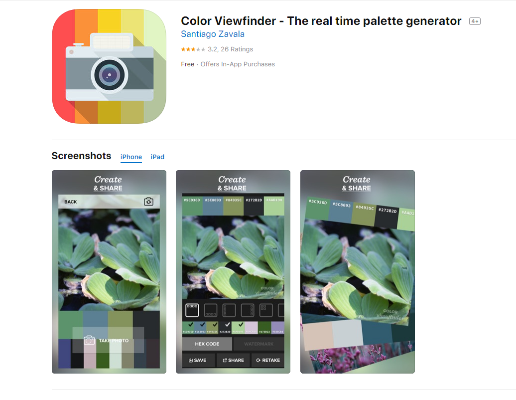 Giống như 2 ứng dụng kể trên, Color Viewfinder cũng có thể tạo ra các bảng màu từ loạt ảnh có sẵn trong bộ nhớ điện thoại. Tuy nhiên, điểm đặc biệt của ứng dụng này nằm ở chỗ, nó có thể tạo ra các bộ màu từ những bức ảnh khác nhau, nhờ đó bạn có thể tạo ra những bảng màu đa dạng và hoàn toàn theo ý muốn cá nhân. Bạn cũng đồng thời có thể chia sẻ tài nguyên màu của mình trên các mạng xã hội.