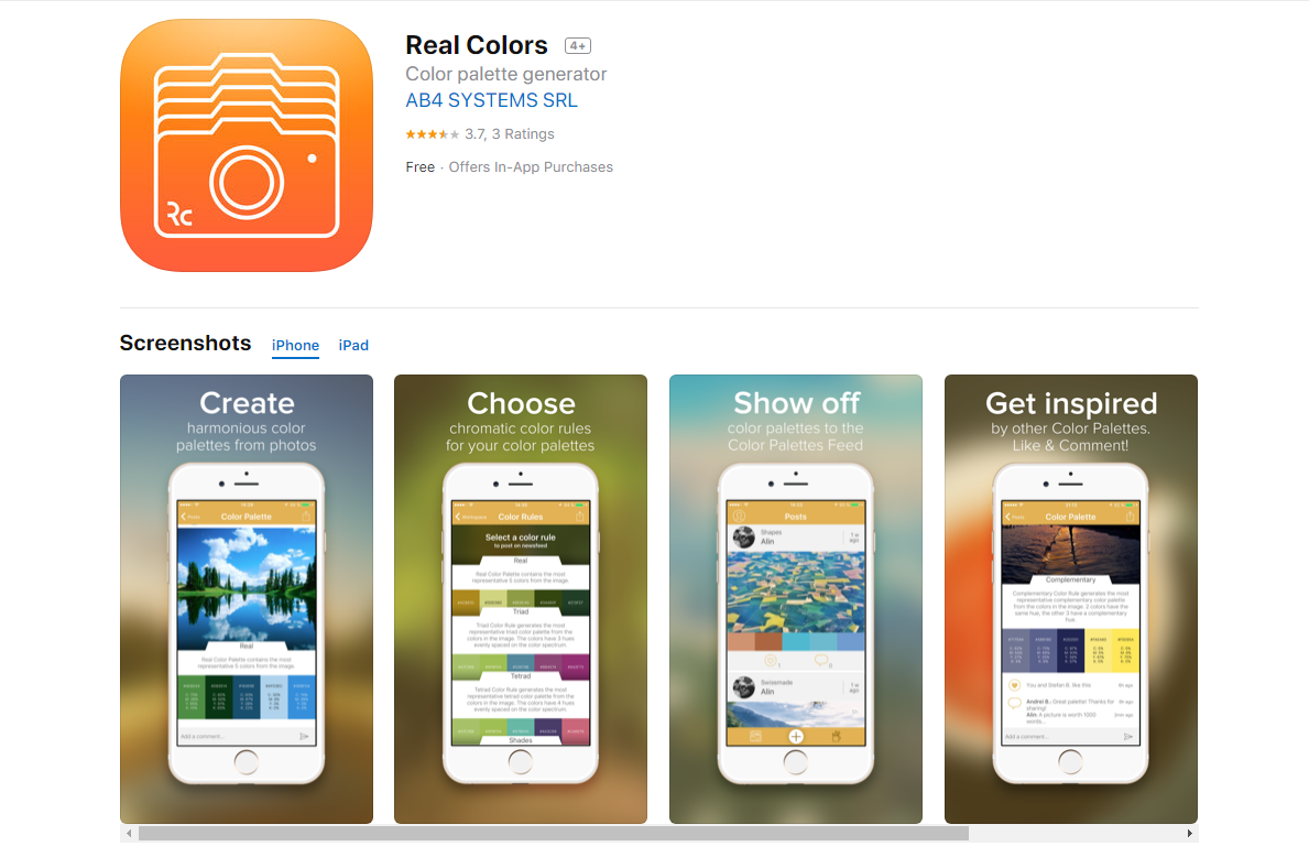 Hoạt động dựa trên nền tảng mạng xã hội, tại đó, người dùng có thể chia sẻ những bảng màu mà mình sáng tạo được. Ngoài ra, bạn thậm chí không cần đăng ký vẫn có thể like và comment về bộ ảnh của người khác. Thế nhưng, Real Colors chỉ cho phép lưu giữ trực tuyến những bảng màu của bạn một khi bạn đăng ký bằng Facebook hoặc Email. Trong khi phiên bản miễn phí chỉ hiển thị năm màu trong ảnh với mã CMYK tương ứng, bạn cần bỏ ra $5 để sử dụng phiên bản Pro với những tính năng cao cấp như kết hợp màu theo các tiêu chí như đơn sắc, màu bổ sung, v.v. Ngoài ra, bạn hoàn toàn có thể chia sẻ kết quả của mình trên các nền tảng mạng xã hội như Facebook , Pinterest và Instagram. Real Colors hỗ trợ các thiết bị chạy hệ điều hành iOS và Android với 3 ngôn ngữ: Anh, Pháp và Bồ Đào Nha.