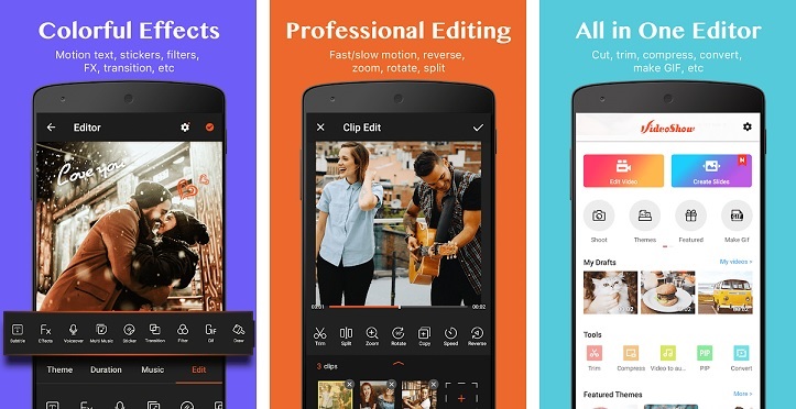 Nhắc đến chỉnh sửa video không thể không nhắc đến VideoShow Video Editor, một ứng dụng edit video được rất nhiều người yêu thích và sử dụng hiện nay. Với VideoShow bạn sẽ nhận được đầy đủ bộ công cụ chỉnh sửa, tạo video từ ảnh có sẵn; bộ lọc màu và template đa dạng; kho âm thanh phong phú; các kiểu font chữ nghệ thuật;... Bạn cũng có thể biên tập, ghép nối video, điều chỉnh tốc độ phát video cũng như sử dụng miễn phí, chia sẻ video trên mạng xã hội.