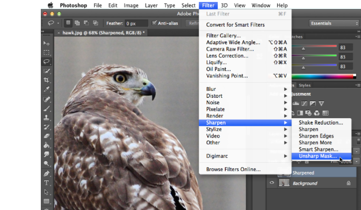 2. Ở bản sao của ảnh chọn Filter > Sharpen > Unsharp Mask hoặc chọn Enhance > Unsharp Mask nếu bạn đàng dùng Photoshop Elements