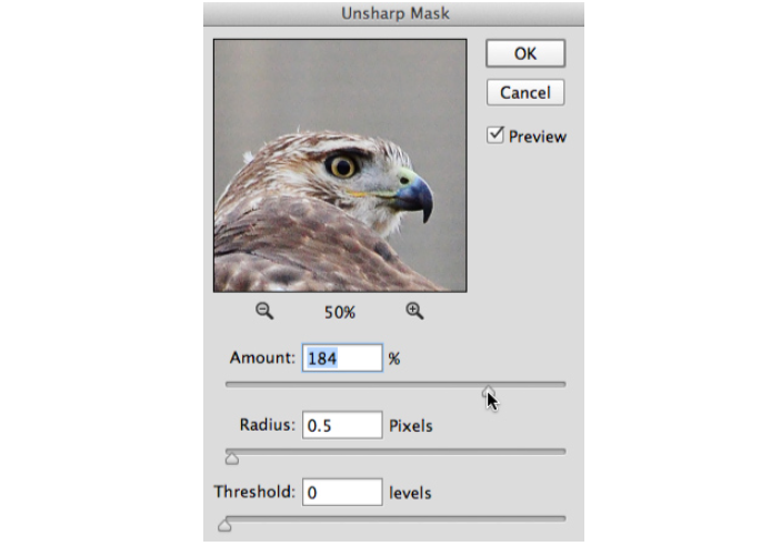 4. Bạn có thể bật tắt chế độ xem trước (Preview) để theo dõi kết quả unsharp nhé.