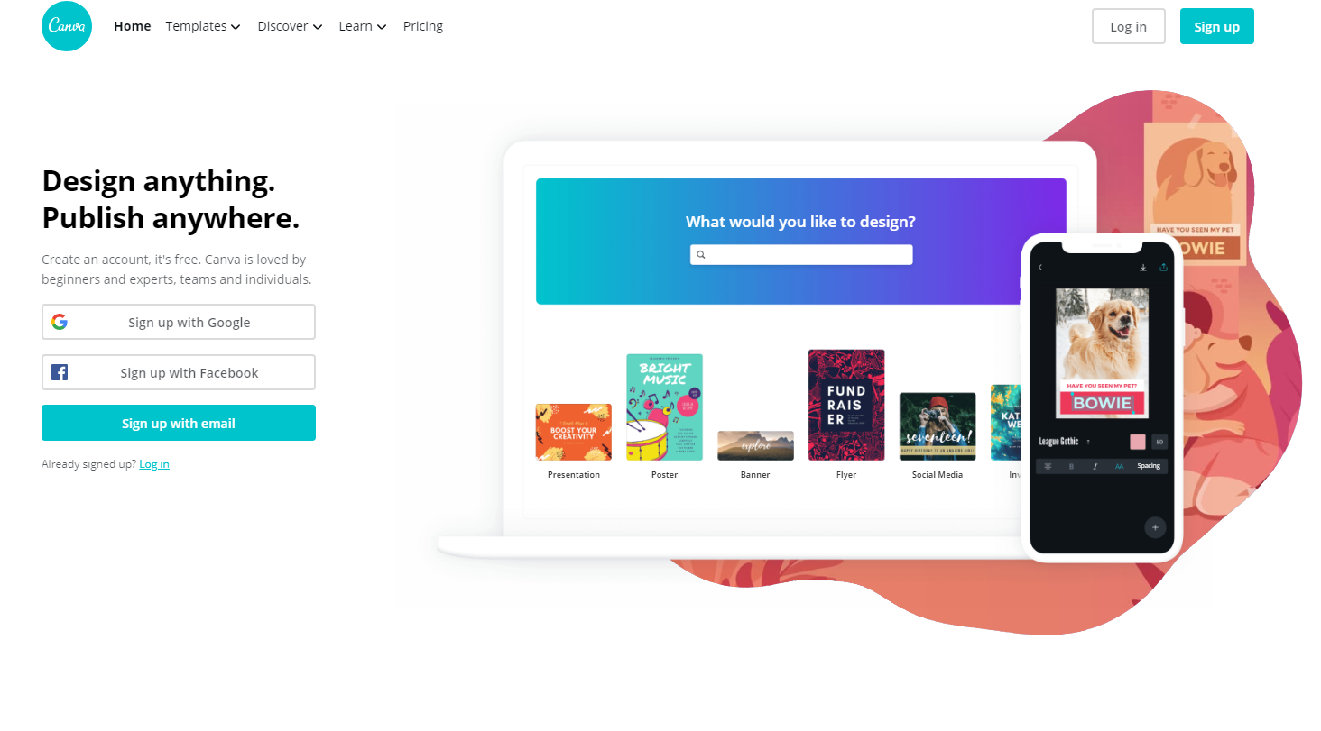 Chắc hẳn Canva là cái tên không còn xa lạ trong lĩnh vực thiết kế online không chỉ poster mà còn đa dạng các hình thức khác như ảnh bìa Facebook, ảnh trên mạng xã hội và loại hình ấn phẩm khác. Canva cung cấp cho bạn nguồn sản phẩm đồ hoạ, hình ảnh, font chữ có sẵn, việc của bạn là lựa chọn những yếu tố thoả mãn nhu cầu của bản thân và hoàn thành thiết kế cho riêng mình. Với Canva, bạn không cần sử dụng những phần mềm đồ hoạ phức tạp nhưng vẫn hoàn toàn có khả năng tạo ra những Poster độc đáo, ấn tượng và không kém phần chuyên nghiệp.