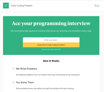 Khác biệt hoàn toàn với các trang web trên, trang này sẽ không cho bạn một danh sách các bài tập mà mỗi ngày sẽ gửi 1 thuật toán vào email cho bạn làm thử. Mức độ bài tập ở mức dễ hoặc trung bình. Trang chỉ cung cấp lời giải khi bạn đăng ký tài khoản Premium. Lời khuyên cho các bạn lập trình khi đi phỏng vấn có bài test kỹ năng code là hãy nhớ đến Daily Coding Problem để luyện tập. Ôn tập 2-3 tuần trước khi thi sẽ giúp bạn tự tin hơn rất nhiều đó.