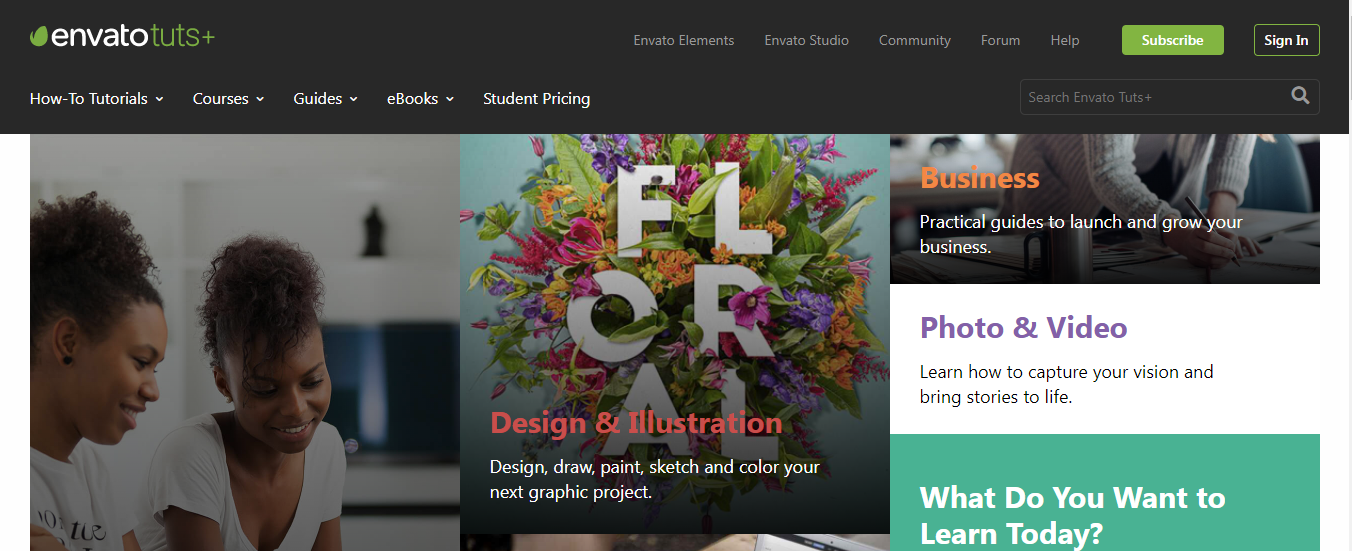 Nếu bạn muốn tìm những khoá học thiết kế miễn phí thì Envatotuts+ là địa chỉ uy tín nhé. Ở đây bạn chủ yếu tìm thấy các khoá học design ngắn hạn, nội dung có thể là hướng dẫn các kiến thức cơ bản hoặc chuyên sâu vào một chủ đề nhất định nhé.