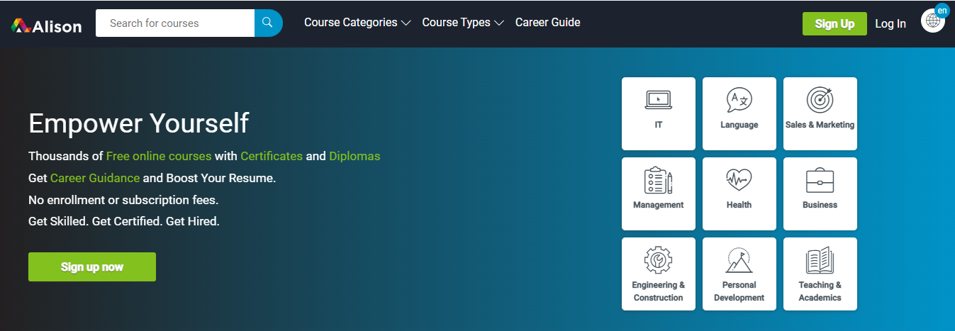 Ngay từ khi mới ra mắt, Alison đã gây ấn tượng bằng các khoá học kết hợp giữa lý thuyết và thực hành. Ưu điểm của Alison với các website khác là bạn có thể nhận được chứng chỉ hoàn thành khoá học nhé.