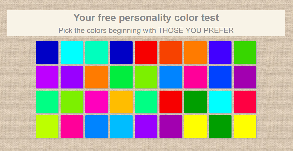 Test Color là bài test dựa vào những màu sắc để khám phá chuyển động của cảm xúc. Đây là kết quả dựa trên nghiên cứu được thực hiện trong suốt 20 năm của nhóm nhà tâm lý học đứng đầu là Thierry Leroy – nhà tâm lý học lâm sàng và nhà phân tâm học. Các bài kiểm tra dựa trên cảm xúc phơi bày rõ bản chất của người tham gia hay nói cách khác, bằng các liên kết cảm xúc, chúng sẽ tiết lộ bạn là ai.