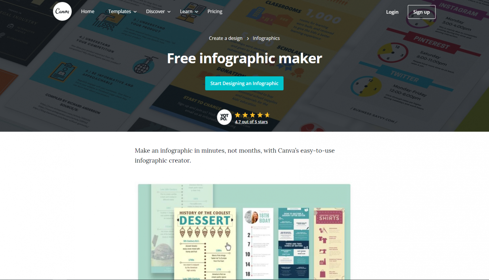 Sử dụng giao diện kéo thả, Canva là một công cụ trực tuyến mạnh mẽ và dễ sử dụng với tất cả mọi người. Bên cạnh những yếu tố đồ hoạ cao được cung cấp với giá 1 USD/yếu tố, Canva Inforgraphic Maker cũng cung cấp miễn phí cho ngời dùng một kho tàng đa dạng bất tận hình ảnh, phông chữ, các mẫu thiết kế có sẵn,… Dịch vụ này hiện nay được hỗ trợ trên tất cả các trình duyệt thông dụng hoặc ứng dụng Canva cho iPad tại đây.
