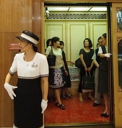 Đất nước Nhật Bản tại những cửa hàng bách hóa trung tâm mua sắm luôn có những tiếp viên thang máy trong bộ đồng phục chỉnh chu như tiếp viên hàng không cùng với những nghi lễ, lễ phép lời chào thân thiện tới hành khách khi sử dụng thang máy. Ở mỗi tầng mỗi khu trọng điểm sẽ được phân công một cô gái xinh đẹp thân thiện chức vụ là “tiếp viên thang máy” với trọng trách bên cạnh thể hiện sự mến khách ngoài ra tiếp viên thang máy còn có nhiệm vụ cao cả trong việc hướng dẫn hành khách khi sử dụng thang máy đúng cách giúp đỡ những người tàn tật, khiếm thị sử dụng thang một cách dễ dàng giúp họ tự tin hơn khi sử dụng thang không còn mặc cảm hay e ngại khi phải làm phiền tới người lạ.