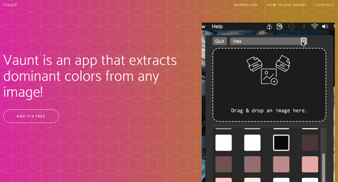 Nếu bạn muốn biến những bức ảnh bạn đang sử dụng trong thiết kế của mình thành một tổng thể màu phù hợp, thì Vaunt là một ứng dụng miễn phí dành cho iOS có thể giúp bạn rất nhiều. Rất đơn giản, nó sẽ chiết xuất những màu sắc nổi bật từ bất kỳ hình ảnh nào và liệt kê chúng cho bạn. Đơn giản chỉ cần mở ứng dụng Vaunt, kéo và thả một hình ảnh và nhấp vào một màu bạn chọn.