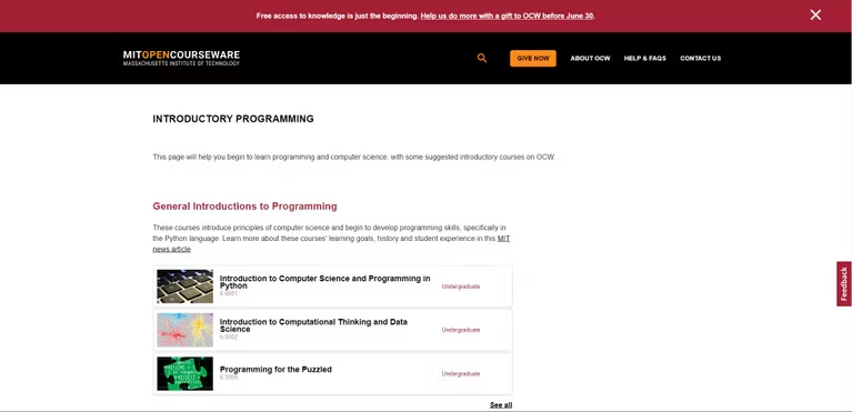 MIT OpenCourseWare (OCW) là một trong những khóa học mã hóa miễn phí tốt nhất dành cho người mới bắt đầu vì bạn có thể trải qua các khóa học lập trình khác nhau theo tốc độ học của riêng mình. Các khóa học đề cập đến những điều cơ bản và cung cấp quyền truy cập vào tất cả các bài giảng, trang trình bày và bài tập được sử dụng trong video hướng dẫn. Các khóa học lập trình máy tính của MIT OCW có các bài giới thiệu về Khoa học Máy tính và lập trình bằng Python cùng với các ngôn ngữ khác. Ngoài ra, bạn có thể mong đợi nhiều tài liệu toàn diện về các lĩnh vực cụ thể như học máy và điện tử.
