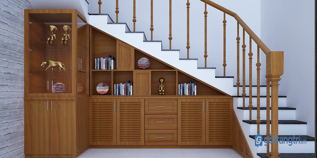 Bạn có rất nhiều những đồ vật kỷ niệm muốn lưu giữ và trưng bày nhưng không thể tìm được không gian thích hợp? Vậy bạn có thể thử bằng cách thiết kế riêng một chiếc tủ nhỏ vừa vặn dưới gầm cầu thang và đặt lên nó những đồ vật kỷ niệm của mình. Thiết kế này được sử dụng rất phổ biến, giúp không gian nhà trở nên xinh xắn mà vẫn gọn gàng, ngăn nắp.