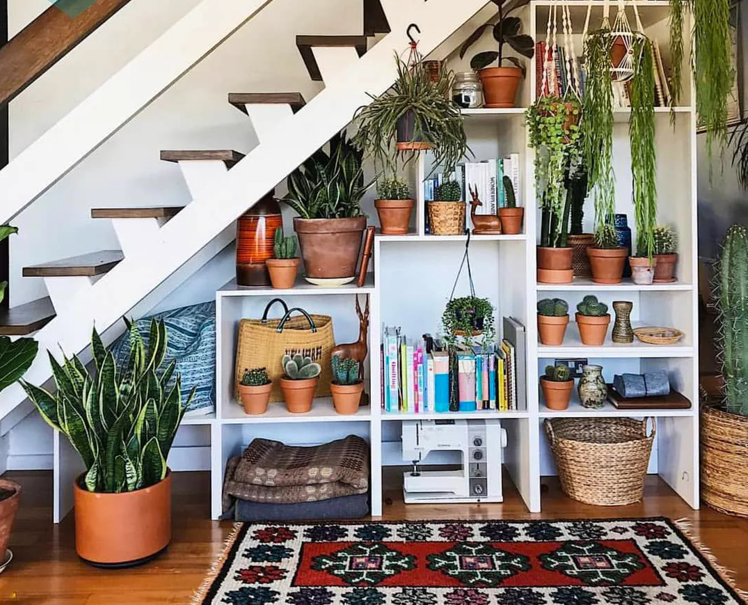 Thật tuyệt vời khi biến ngôi nhà của bạn trở nên thân thiện hơn với môi trường nhờ cây xanh. Bạn có thể chọn những loại cây ưa bóng và tạo một góc nhỏ ấm cúng cho chúng ngay dưới gầm cầu thang nhà mình. Ý tưởng về một chiếc giá được thiết kế vừa vặn với không gian gầm cầu thang và đặt lên chúng các chậu cây nhỏ kèm đồ trang trí không chỉ giúp lấp đầy khoảng trống mà còn tạo độ sâu cũng như giúp ngôi nhà trở nên thoáng đãng.