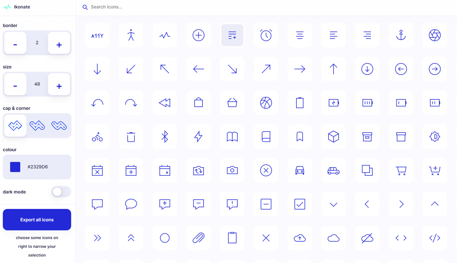 Nếu bạn đang tìm kiếm những icon đồng bộ cho cùng thiết kế thì Ikonate chính là một địa chỉ hữu ích dành cho bạn bởi nó có tới hơn 300 biểu tượng với khả năng tuỳ chinh đa dạng, từ việc thay đổi biểu tượng, kích thước đường viền đến độ mềm của góc và màu sắc đều có thể thực hiện nhanh chóng trên website của họ.