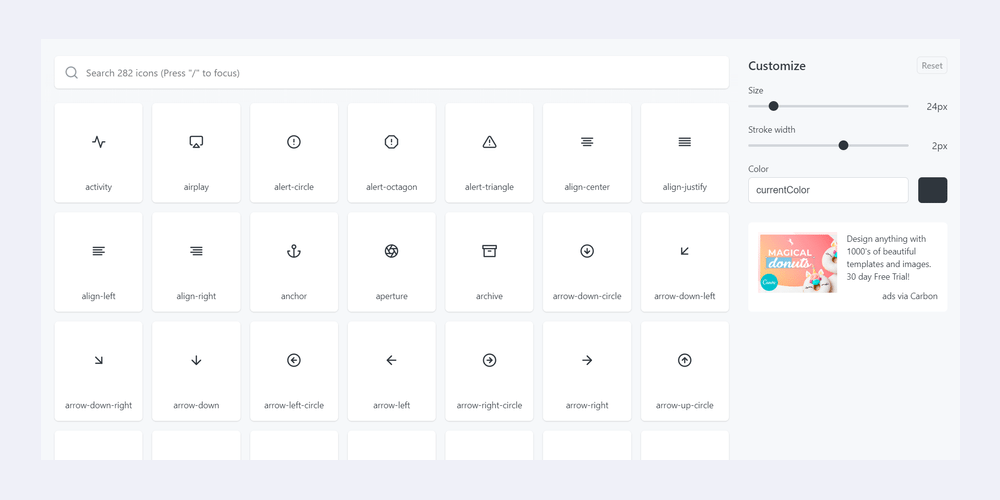 Với Feather, bạn sẽ được hỗ trợ việc trang trí giao diện Web, ứng dụng một cách hiệu quả nhờ vào tập hợp các biểu tượng UI đẹp và tối giản một cách hoàn hảo. Có khoảng 300 biểu tượng cho bạn lựa chọn.