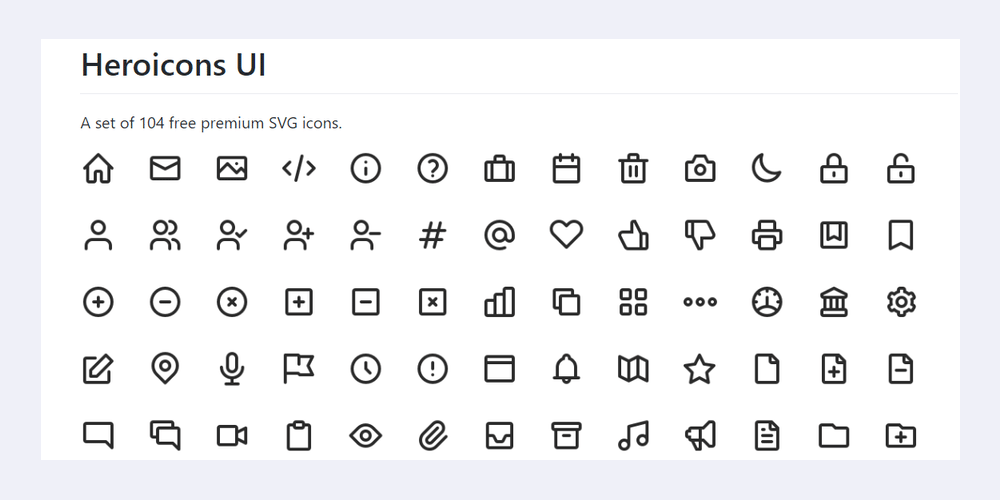 Thư viện của Heroicons UI này có khoảng 100 biểu tượng các loại theo phong cách dày với đủ yếu tố để làm nổi bật trang web của bạn. Bộ này là miễn phí để sử dụng theo giấy phép MIT, có nghĩa là bạn cũng có thể đưa chúng vào các dự án thương mại.