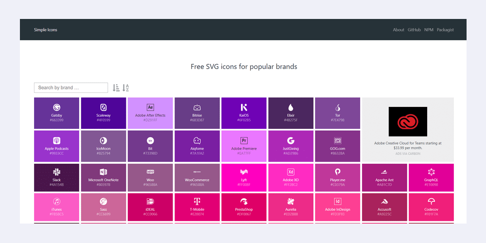 Nếu bạn quan tâm điến biểu tượng của các thương hiệu trực tuyến nổi tiếng như Spotify, Skype hoặc Firefox, thì đây chính là website dành cho bạn. Hàng trăm biểu tượng SVG được sắp xếp sáng tạo, hợp lí cho mục đích sử dụng của bạn. Công cụ tìm kiếm và sắp xếp theo thứ tự bảng chữ cái có thể được sử dụng hiệu quả để phục vụ nhu cầu của bạn.