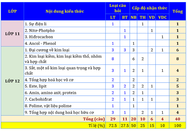 Trong môn hóa học, khoảng hơn 70% số câu hỏi trong đề là lý thuyết và 30% là câu hỏi dạng bài tập tính toán. Trong đề chỉ có 4 câu hỏi ở mức độ vận dụng cao thuộc các chương tổng hợp hóa hữu cơ, hiđrocacbon, đại cương với kim loại sắt và một số kim loại quan trọng và hợp chất. Các câu hỏi này sẽ giúp đề thi phân hóa được thí sinh tốt hơn. Các câu hỏi thuộc phần kiến thức này không chứa dạng bài Al3+ ion OH tạo AlOH3 kết tủa rồi kết tủa tan trong OH dư hoặc các dạng bài tập tính toán liên quan đến phản ứng hóa học giữa ion AlO 2 với ion H+ tạo AlOH3 kết tủa rồi kết tủa tan trong H+ dư. Đề thi đảm bảo nội dung theo các công văn hướng dẫn điều chỉnh nội dung dạy học trong năm học 2022-2023.