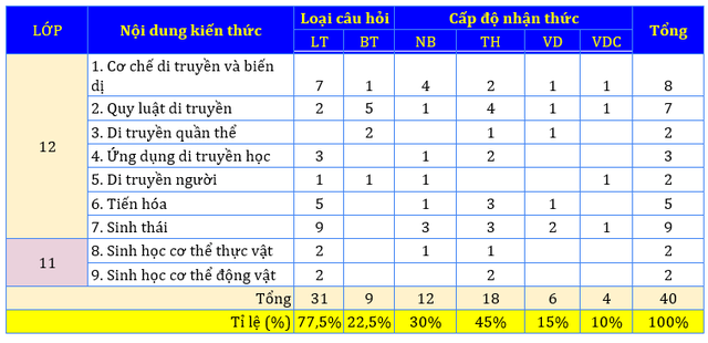 Trong đề minh họa môn sinh học 2023, đề thi có khoảng gần 80% câu hỏi lý thuyết và khoảng 20% câu hỏi là bài tập. Trong các câu hỏi lý thuyết của đề thi thuộc mức nhận biết - thông hiểu, trong đó bốn câu thuộc chương trình sinh học lớp 11 và 26 câu thuộc chuyên đề của chương trình Sinh học lớp 12. Độ khó của đề thi đảm bảo được học sinh có lực học trung bình khá có thể đạt điểm từ 6 đến 7,5, đáp ứng được mục tiêu xét công nhận tốt nghiệp. Đề thi không xuất hiện nhiều câu hỏi dạng tính toán, với 20% câu hỏi của đề thi ở mức độ vận dụng và vận dụng cao đều thuộc chuyên đề tiến hóa sinh thái và thiên hướng dạng lựa chọn số lượng phát biểu đúng sai.