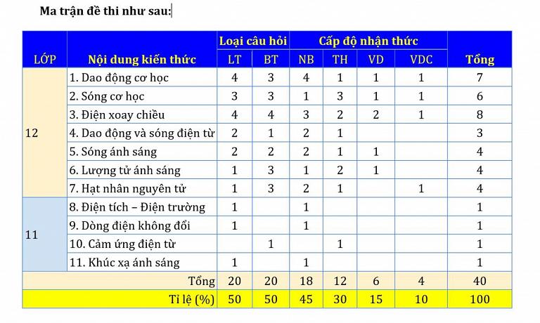 Đề thi tham khảo môn vật lý có 50% số câu hỏi là bài tập tính toán và 50% số câu hỏi là phần lý thuyết. Đề thi minh họa không xuất hiện dạng câu hỏi mới và không có loại câu hỏi kết hợp kiến thức của nhiều chuyên đề. Các câu hỏi khó của đề thi chủ yếu vào các chuyên đề quen thuộc trong chương trình Vật Lý 12 như dao động cơ, sóng cơ, sóng âm, điện xoay chiều và hạt nhân nguyên tử.