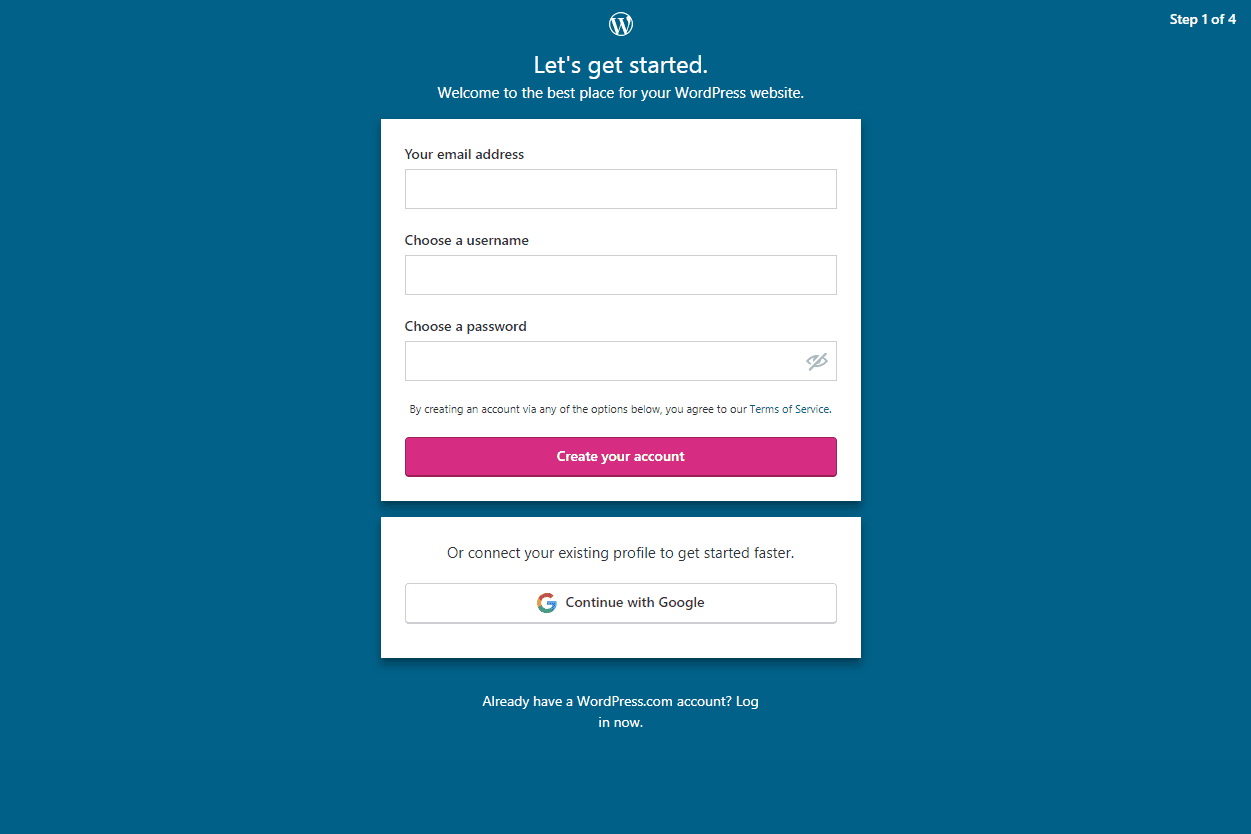 Truy cập vào https://wordpress.com/, chọn ngôn ngữ của bạn và làm theo hướng dẫn để tạo một tài khoản miễn phí. Việc tạo tài khoản này cũng giống như các bước tạo tài khoản trên các nền tảng xã hội khác.