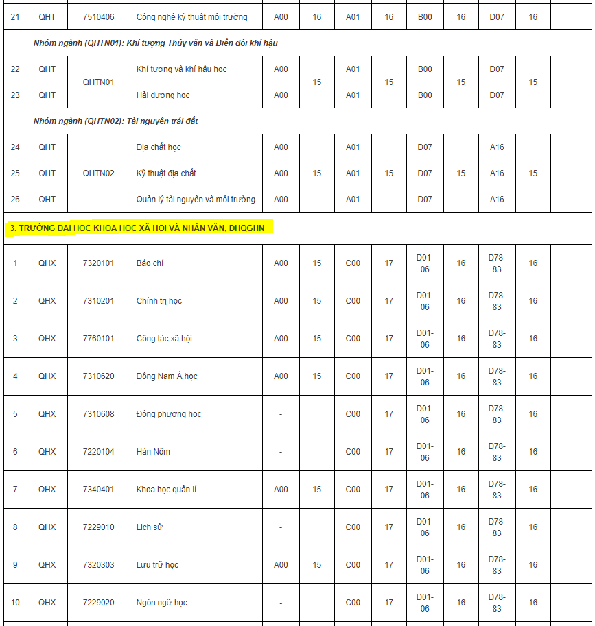 Điểm xét tuyển đạt ngưỡng điểm theo ngành/chương trình đào tạo như sau: