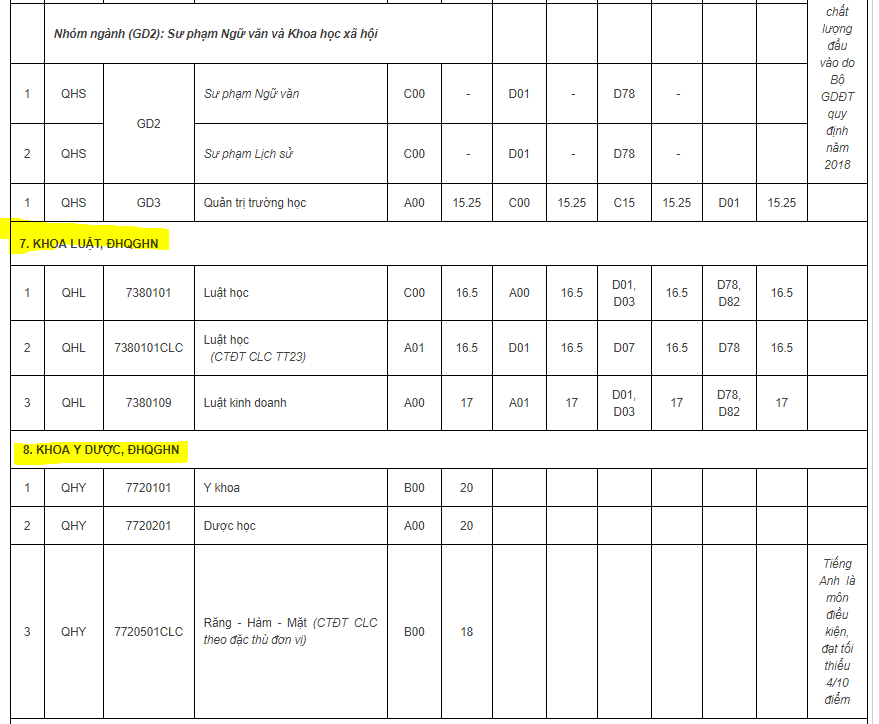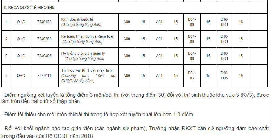 Đại học Hà Nội thông báo điểm sàn xét tuyển đại học hệ chính quy năm 2018 là 15 trở lên (thang điểm 10, chưa nhân hệ số). Mức điểm này được tính là tổng 3 môn thi Toán, Ngữ văn, Ngoại ngữ, hoặc Toán, Vật lý, Tiếng Anh.