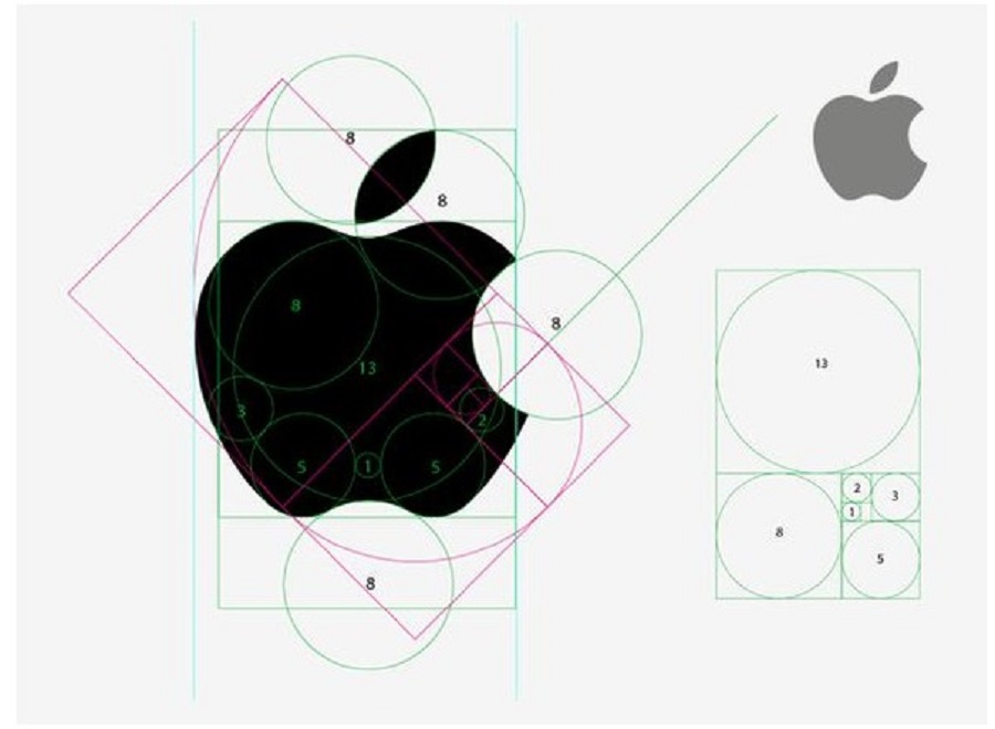 Ví dụ điển hình cho thiết kế logo áp dụng tỷ lệ vàng đó chính là của Tập đoàn Apple. Logo của tập đoàn không chỉ đẹp theo tỷ lệ vàng mà còn mang ý nghĩa rất lớn. Với hình ảnh một trái táo khuyết, logo muốn ám chỉ sự không hoàn hảo của mỗi con người chúng ta. Chúng ta đang cố gắng để ngày một trở nên tốt hơn, hoàn thiện hơn. Nhờ việc áp dụng tỷ lệ vàng vào trong thiết kế logo, Apple đã thành công trong việc biến biểu tượng này thành một thương hiệu riêng và bất kỳ ai nhìn qua cũng biết đó là sản phẩm của thương hiệu nào. Tối giản họa tiết càng làm cho logo này trở nên vô cùng dễ nhớ nhưng cũng không kém phần độc đáo.