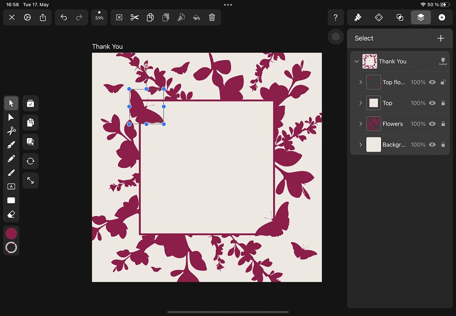 Chọn lớp có các con bướm và hoa đã được đánh dấu và di chuyển các phần tử sao cho các phần nhô ra phía sau hình vuông bên trong.