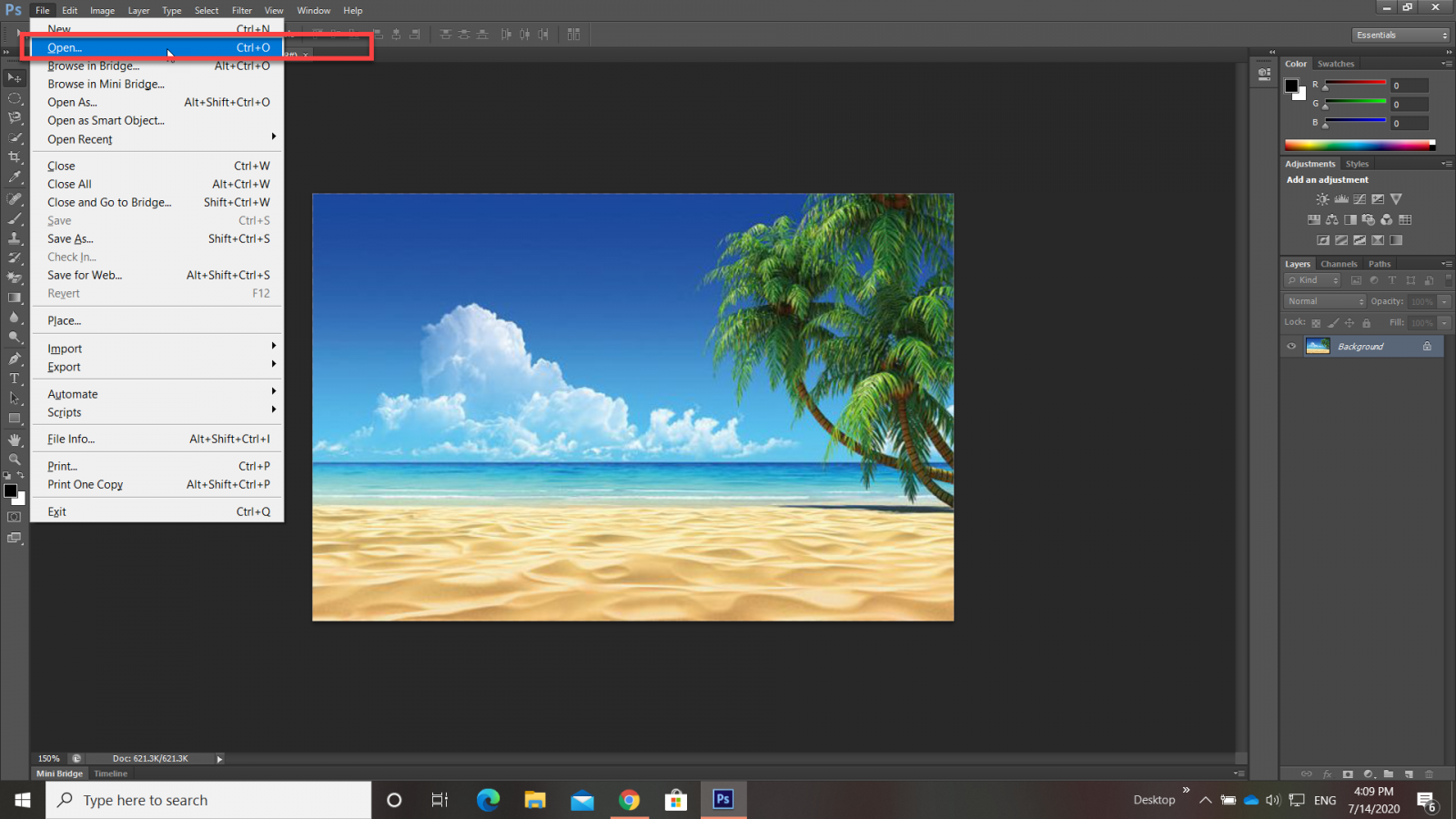 Điều đầu tiên chúng ta cần làm là mở phần mềm Photoshop và bắt đầu thực hiện thao tác mở ảnh. Chọn File => Open hoặc nhấn tổ hợp phím Ctrl + O sau đó chọn ảnh phù hợp để lồng vào chữ nhé!