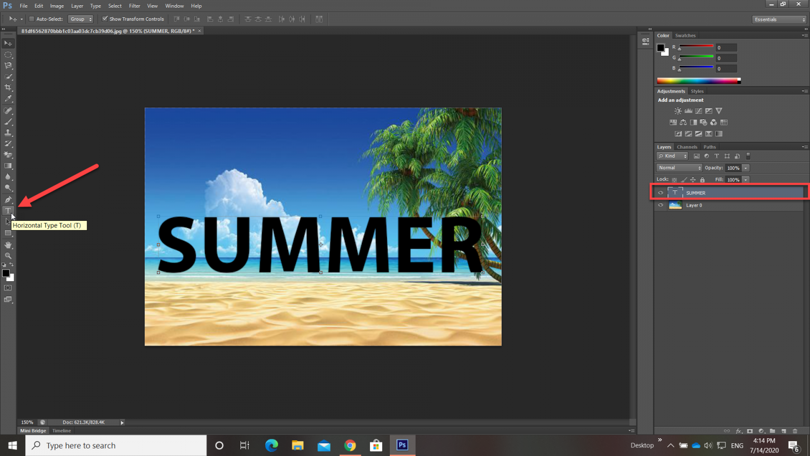 Muốn lồng ảnh vào chữ thì đương nhiên ta cần có một layer text và gõ chữ lên. Chính vì vậy, hãy sử dụng công cụ Type Tool bằng cách nhấn vào biểu tượng như hình minh họa phía dưới hoặc dùng phím tắt T trên bàn phím. Tiếp theo, ta đi tìm vị trí muốn đặt text trong khu vực làm việc để viết chữ bạn mong muốn. Hãy tùy chỉnh kích thước, font chữ, dãn cách dòng,... để phù hợp nhất nhé!