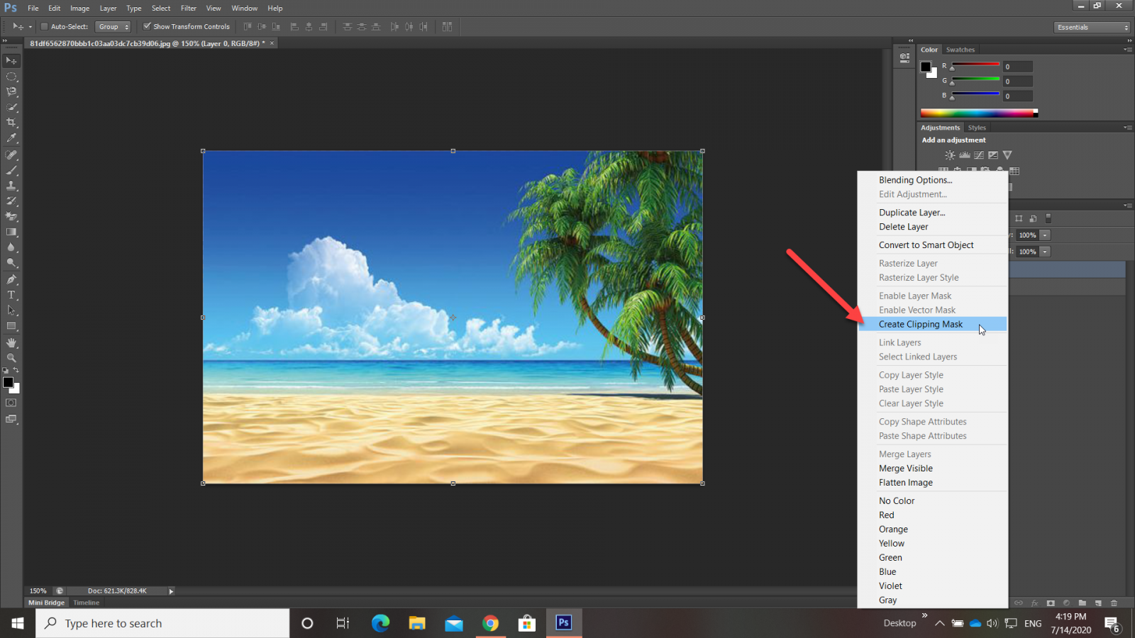 Tại bước này, ta click chuột phải vào layer hình và chọn Clipping Mask như hình minh họa phía dưới. Ngay lập tức toàn bộ phần ảnh sẽ biến mất chỉ còn lại phần lồng trong chữ như ý muốn của bạn