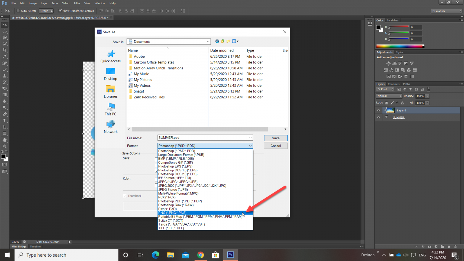 Nếu bạn muốn chèn phần chữ đã xử lý trên vào một background khác thì hãy lưu lại nó dưới dạng png. Chọn File => Save sau đó chọn thư mục muốn lưu file và định dạng file theo kiểu png nhé!