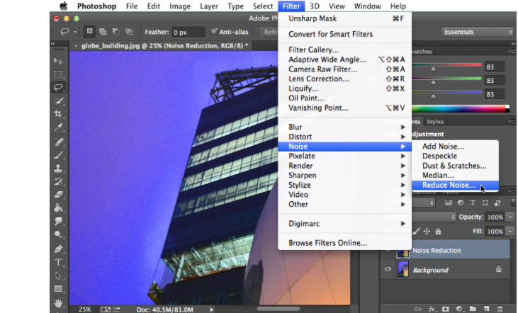 2. Tại layer copy bạn chọn Filter -> Noise -> Reduce Noise.