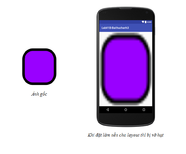 Để phát triển các ứng dụng cho Android, vấn đề cần lưu tâm đó là hệ sinh thái Android có rất nhiều loại thiết bị với các độ phân giải, kích thước màn hình khác nhau. Vì vậy, khi đặt ảnh nền cho các phần như Botton, EditText, Layout … ảnh thường bị vỡ thành hạt. Đây là một hình ảnh điển hình: