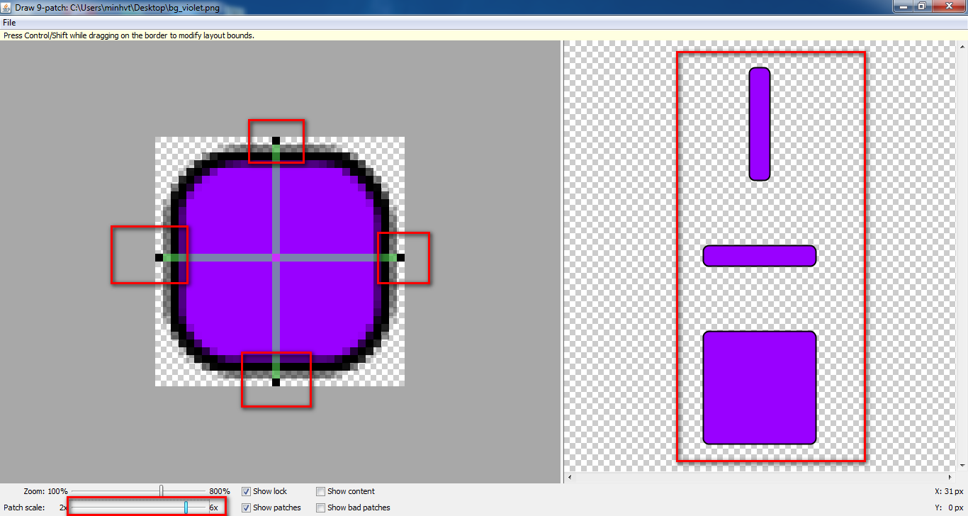 Cách sử dụng công cụ như sau: đặt dấu chấm đen ở 4 cạnh của hình, kéo thanh Patch Scale để xem hình ảnh khi bị bóp méo, co dãn trông như nào ở hình bên tay phải. Nếu dùng draw9patch.bat thì bạn cần save lại với phần mở rộng là .9.png. Xem hình 12: