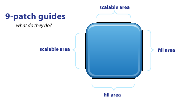 Để khắc phục tình trạng này, Android đã sử dụng ảnh nine – patch (có khả năng tự co dãn, mở rộng file thường là 9.png). Các ảnh loại này cho phép định nghĩa những vùng trên ảnh có thể kéo căng mà không hề bị vỡ, xem hình 1: