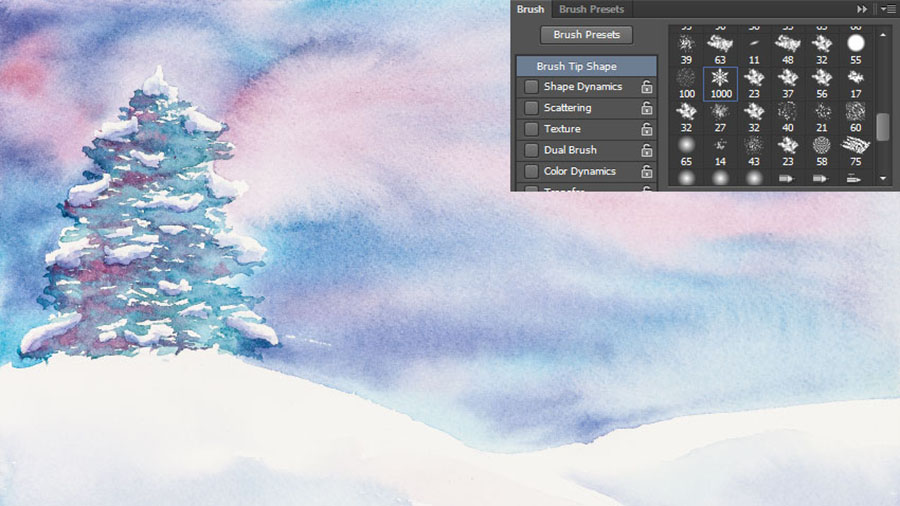 Mở bức ảnh mà bạn muốn thêm hiệu ứng tuyết rơi. Trên Brushes Panel (bảng Brush), chọn Snowflake Brush (brush bông tuyết) mà bạn vừa tạo ở bước 2.