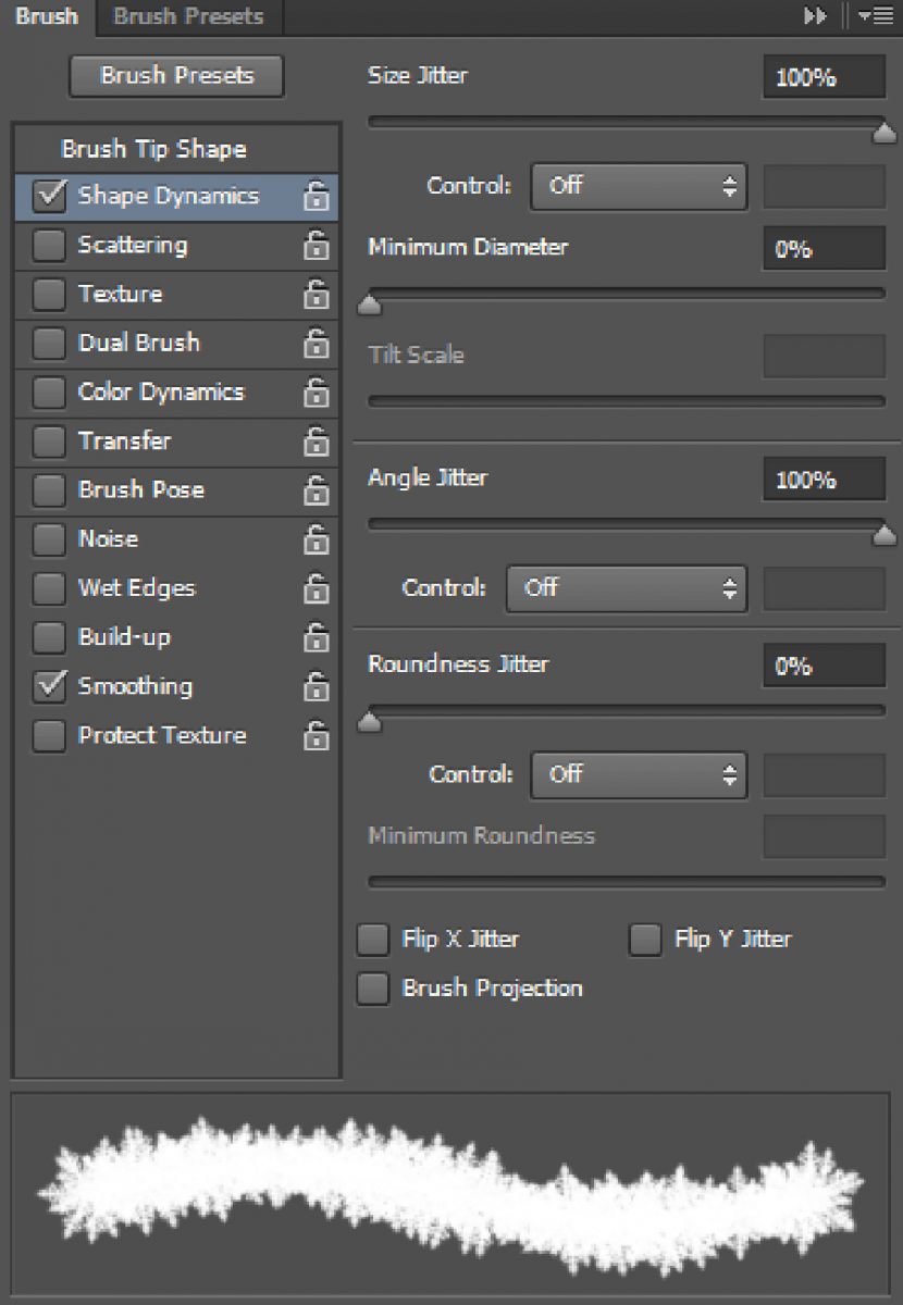 Trên Brush Panel (bảng Brush), mở Shape Dynamics, thiết lập giá trị Size Jilter và Angle Jilter là 100%.