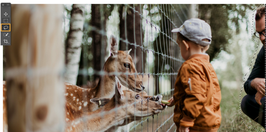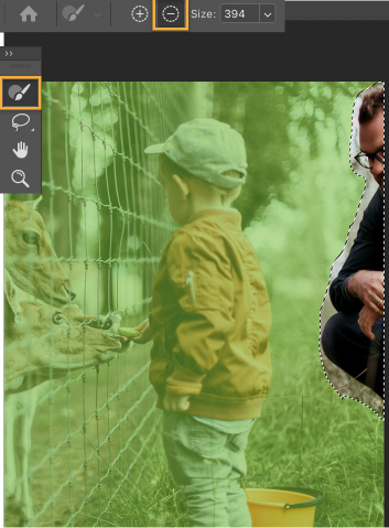 1. Sử dụng công cụ Lasso để vật cần xoá khỏi ảnh. Nếu các phần không mong muốn của hình ảnh được bao gồm trong vùng lấy mẫu, bạn có thể chọn biểu tượng “-” ở trên cùng và sử dụng Brush để tô lên các vùng màu xanh lục để loại bỏ các phần của vùng lấy mẫu.
