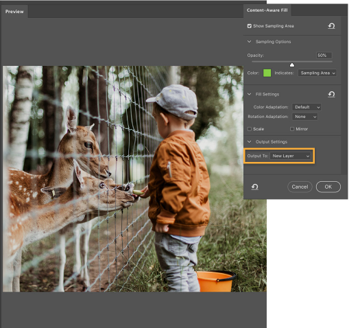 2. Edit -> Content Aware để phần ảnh bị xoá được bôi lớp nền khác tương tự với phần còn lại của ảnh. Ở bảng Content Aware, bạn điều chỉnh các thông số theo ý muốn của mình để đạt được hiệu quả cao nhất nhé. Lưu ý nhỏ là bạn chọn Output To là New Layer để kết quả chỉnh sửa được tạo thành 1 layer mới, không ảnh hưởng đến file ảnh gốc nhé.