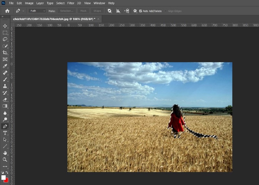 Bước 1: Mở ảnh mà bạn cần xóa vật thể, chi tiết thừa trên Photoshop. Dùng công cụ để tạo vùng chọn cho vật thể mà bạn muốn xóa.