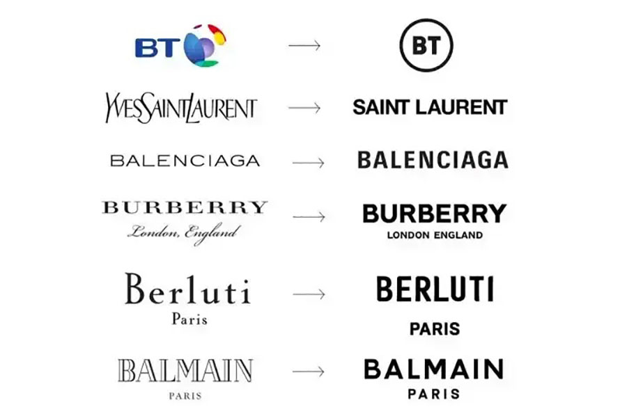 Nhiều thương hiệu thời trang xa xỉ như Bugatti, Burberry, Balenciaga đã thay đổi logo của mình theo hướng tối giản nhất có thể bằng cách sử dụng font sans serif đặt trên nền trắng và hầu như không sử dụng thêm yếu tố đồ họa đặc biệt nào khác. Đây là trào lưu “anti branding”