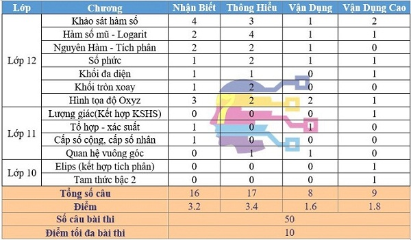 Đối với môn Toán nói riêng, hình thức thi vẫn là 50 câu trắc nghiệm, làm trong khoảng thời gian 90 phút, tức trung bình mỗi câu cần 1 phút 48 giây. Giới hạn ôn tập chung cho môn học này là kiến thức cả ba năm học THPT. Tuy nhiên, nội dung trọng tâm cần chú ý nhiều hơn rơi vào các chuyên đề lớp 12 với các câu hỏi có mức độ phân cấp khác nhau.