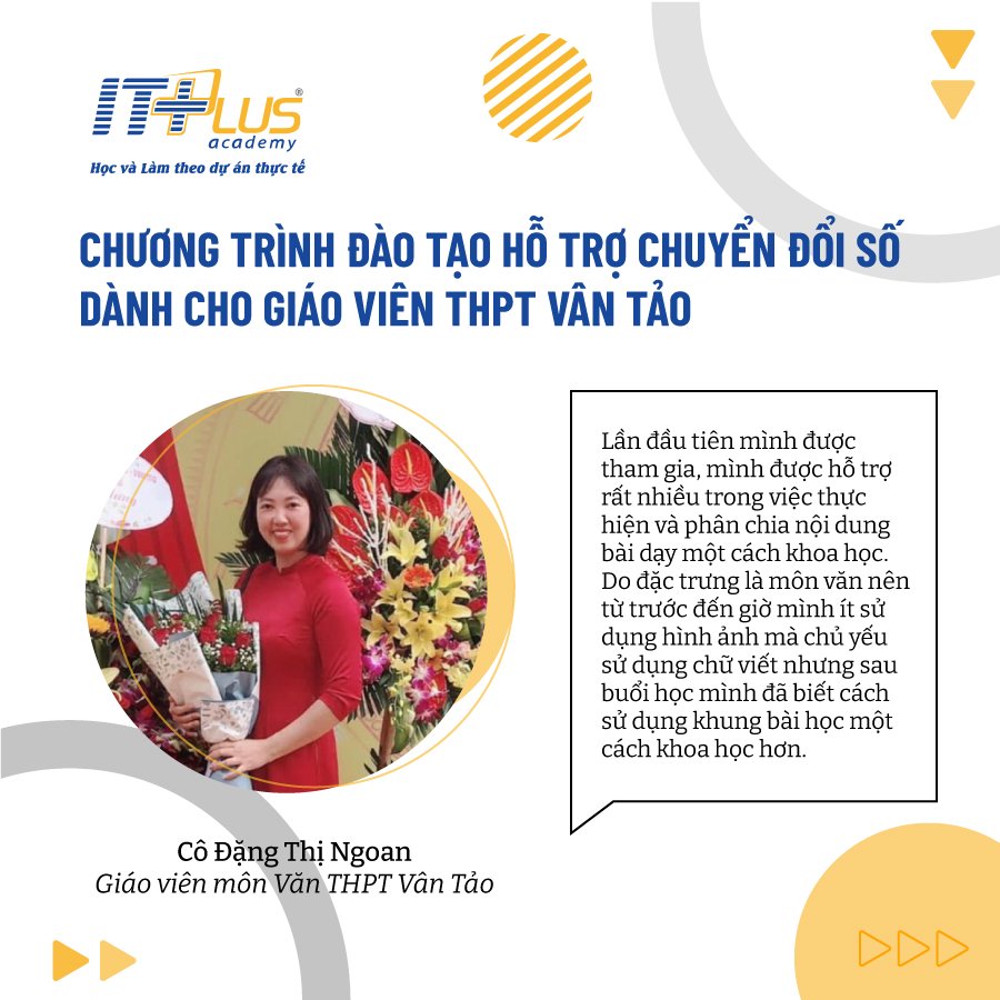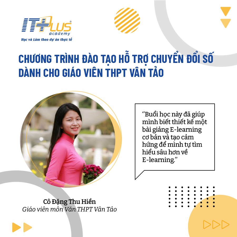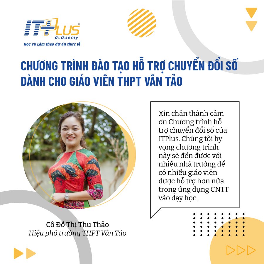 Cô Đỗ Thị Thu Thảo: Tháng 12 năm 2021, ITPlus Academy đã hợp tác với trường THPT Vân Tảo mở khóa tập huấn CNTT cho giáo viên trường THPT Vân Tảo. Khóa học đã đáp ứng đứng mong mỏi của các thầy cô và nhà trường: khóa tập huấn ngắn hạn, thiết thực, thiên về thực hành, “cầm tay chỉ việc”. Qua khóa học, các thầy cô giáo trường THPT Vân Tảo đã được bổ sung kiến thức và kĩ năng làm việc nâng cao với phần mềm Power point, quy trình sản xuất bài Elearning. Sau khóa học, các thầy cô tự tin có những sản phẩm CNTT chuyên nghiệp phục vụ hiệu quả hoạt động dạy học đổi mới.
