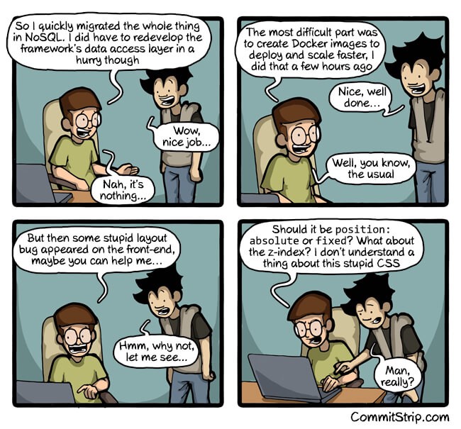 Ngay cả ngày nay, dù bạn gọi mình là “full stack developer” hay là “front end developer” ... dù bạn có "một năm kinh nghiệm" hay "8 năm kinh nghiệm", CSS vẫn sẽ ném bạn vào vòng lặp ngay tức khắc.